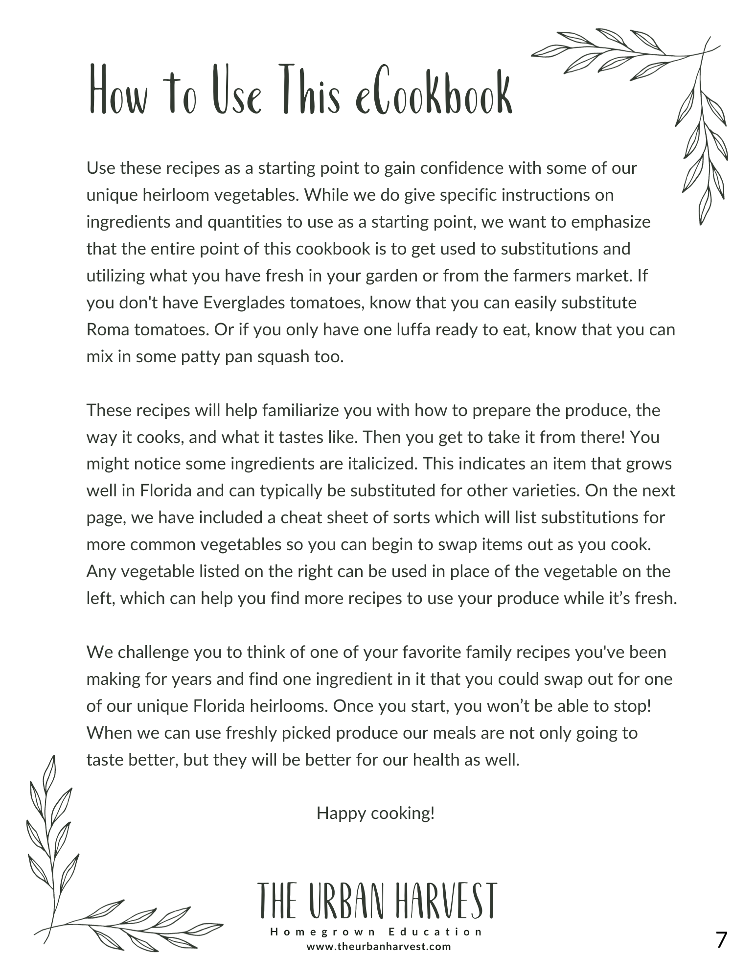 A color photo e-cookbook with over 50 recipes using unique Florida heirloom produce like roselle, snake bean, tokyo bekana, seminole pumpkin, and more than 30 other veggies/fruits. Recipes are divided into 5 categories: